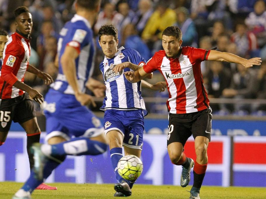 La primera vez que se vieron las caras (jornada 8), el partido se desarrolló en Riazor. El Dépor comenzó con Lux; Juanfran, Sidnei, Arribas, Navarro; Juan Domínguez, Mosquera; Fayçal, Cani, Luis Alberto y Lucas, y el Athletic Club salió al césped con Iraizoz; De Marcos, Etxeita, Laporte, Balenziaga; San José, Beñat; Susaeta, Raúl García, Williams y Aduriz, y el partido estuvo marcado por la victoria hasta el minuto 65 del Athletic de Bilbao (0-2, con goles de Williams y Aduriz) y que fue remontado en 10 minutos (el primer gol deportivista fue en el 79 por parte de Lucas Pérez, con un voleón sin ver la portería dentro del área, y el empate lo certificó Arribas en un córner de cabeza) en un partido que tuvo un resultado justo para ambos conjuntos.
